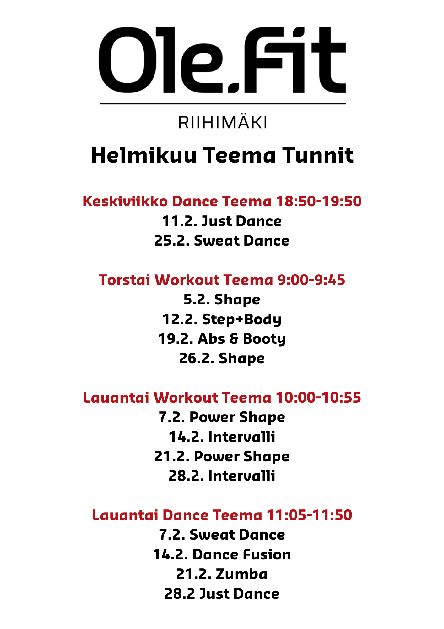 Perjantain klo 17:50-18:45 Power Cross ohjataan Ryske Zonessa 6.2., 13.2., 6.3. ja 13.3. Tunnin ajan Ryske Zone varattu ryhmän käyttöön. Tunti ohjataan Ohjattujen tuntien salissa 23.1., 30.1., 20.2., 27.2., 20.3. ja 27.3.
