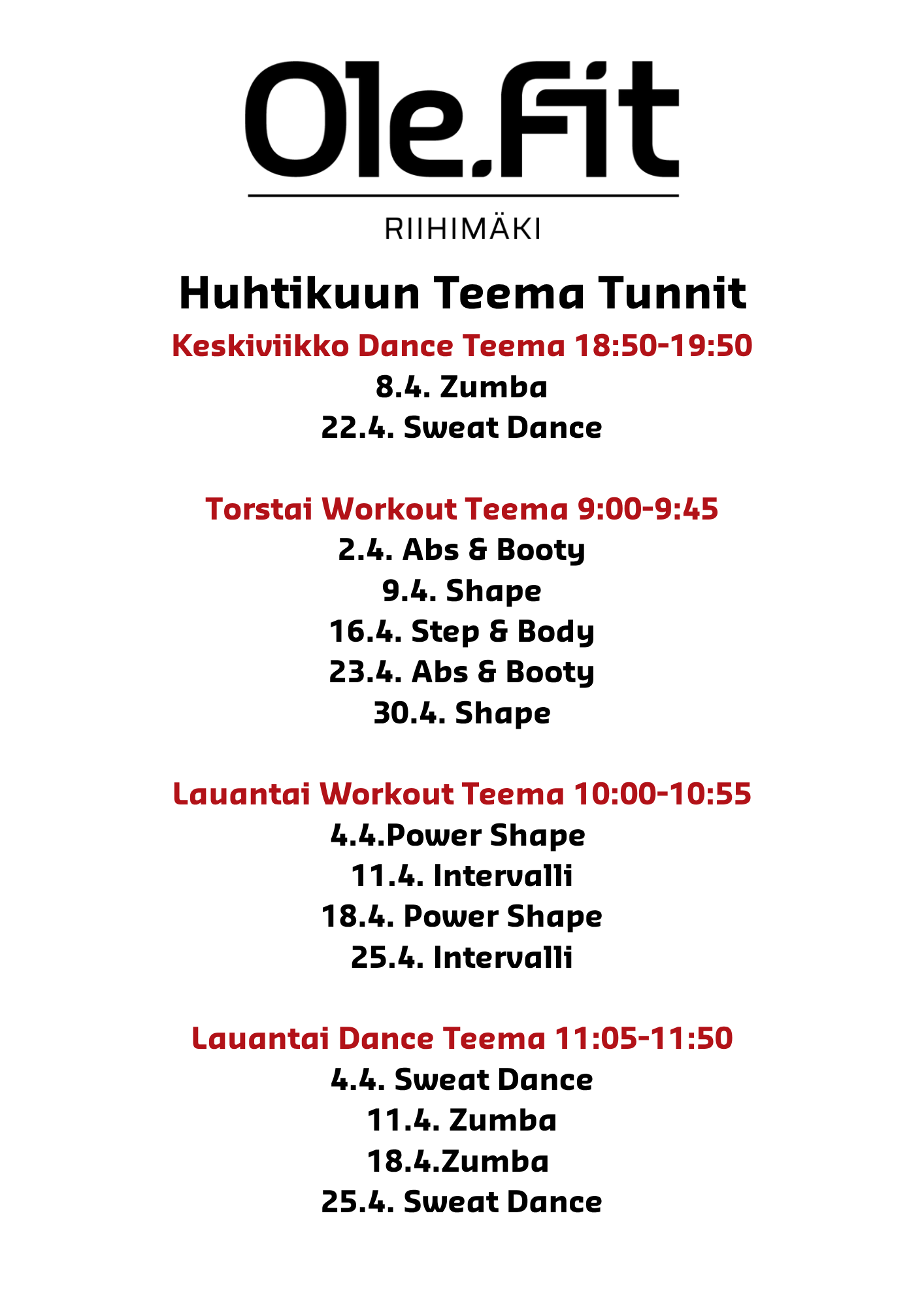 Perjantain klo 17:50-18:45 Power Cross ohjataan Ryske Zonessa 10.4., 17.4. ja 8.5. Tunnin ajan Ryske Zone varattu ryhmän käyttöön. Tunti ohjataan Ohjattujen tuntien salissa 24.4., 15.5. ja 22.5.